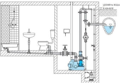 | Подземные установки | Сантехническое оборудование (унитаз, раковина, душ) расположено ниже уровня общей канализационной магистрали. Насос помогает поднять сточные воды на необходимую высоту. |